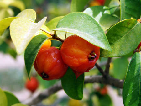 Brazilian Cherry - Acerola Fruit Growing on Tree Branch