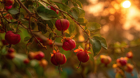 Fresh organic Acerola cherry. Thai or Acerola cherries fruit on the tree with sunset. Acerola is a famous fruit in South America, especially in Brazil.