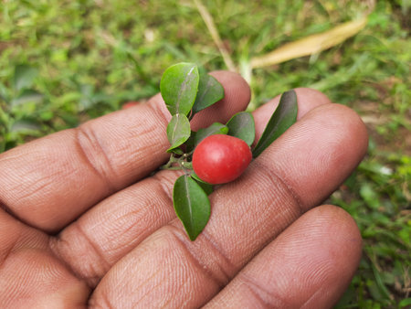 Handful of fruits (Barbados or Thai cherry) on a palm of Asian (Thai) man. Concept of fruitarianism, raw foodism, diet. Concept of offer, proposal, gift, care. Green background