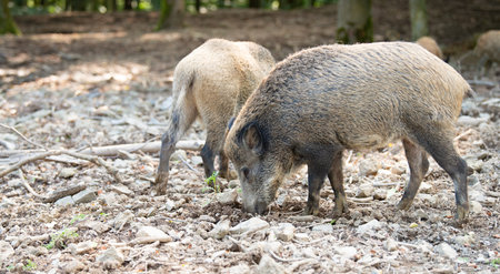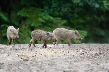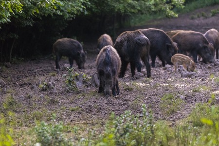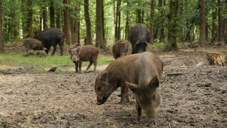 Sus scrofa - The wild boar, which is in the deep forest, is of different ages and seeks food in the dark forest.
