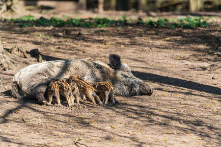 horizontal image with a frontal view of a female wild boar suckling its young with a defensive attitude