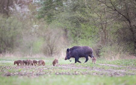 Wild boar mother with cute striped piglets walking on meadow in forest