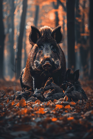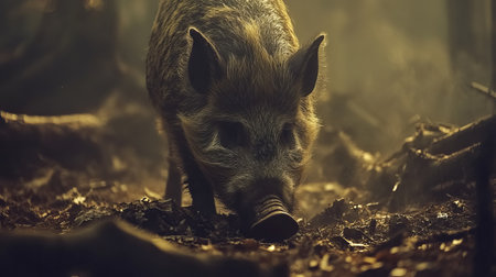 A serene image of a wild boar rooting on the forest floor, surrounded by earthy tones and soft light, highlighting the beauty of wildlife in its natural habitat.