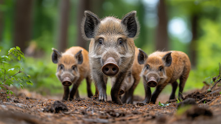 A wild boar mother strolls confidently along a forest path, accompanied by her three playful piglets. Sunlight filters through the trees, highlighting their rustic surroundings and vibrant greenery.
