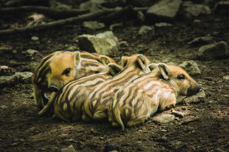 Young wild boar in animal enclosure. Animal theme. Wildlife park in Warstein, Germany