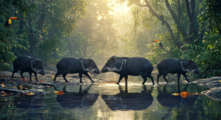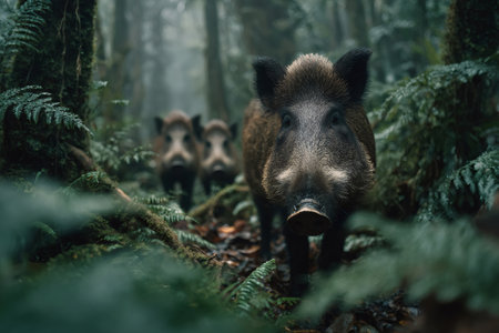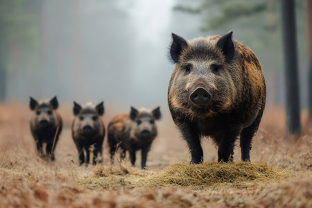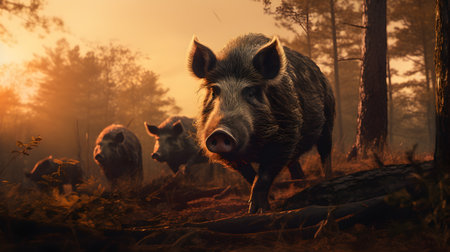 A group of wild boars foraging in a misty forest, creating a serene yet mysterious atmosphere in the wilderness.