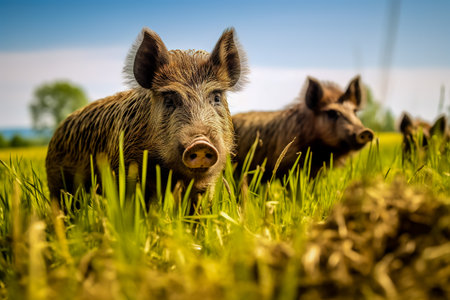 Wild boars feeding on green grain field in summer. Wild pig hiding in agricultural country copy space.