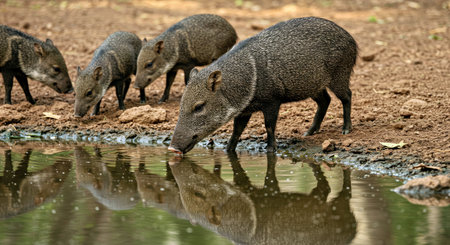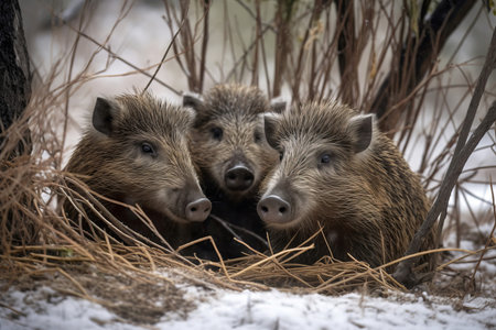 Group of javelina animals in winter season. Furry wild pig in cold nature wintertime. Generate ai