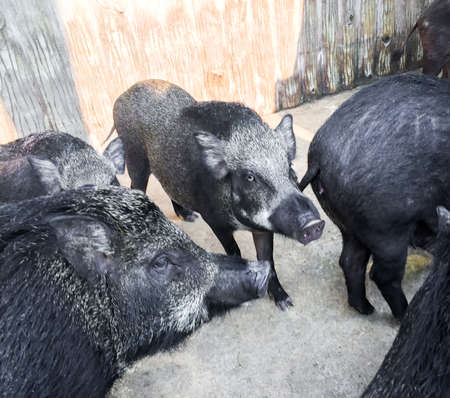 Young Wild Carpathian boar in the closed territory sniffs the earth. Sus scrofa attila