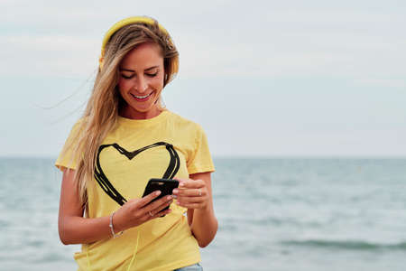 young blonde woman using yellow headphones in front of the beach on a summer cloudy day