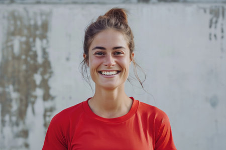 Energetic Athlete Beaming In A Red T-Shirt, With A Playful Ponytail
