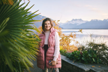 Outdoor portrait of beautiful young woman relaxing by mountain lake, cold weather