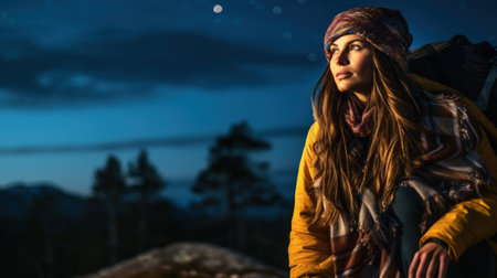 A young woman with long hair and wearing hiking clothes looks into the distance against the background of the night sky.