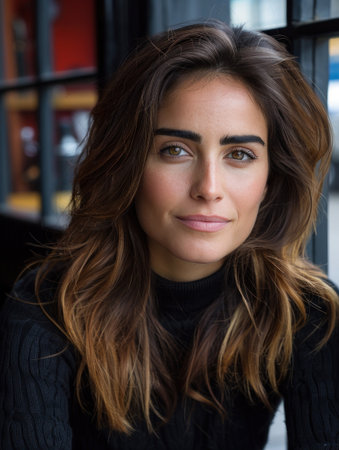 Woman with flowing hair and a welcoming expression enjoys a moment in the bustling caf