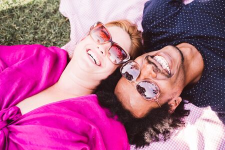 A happy young mixed race couple laying together in the grass in a park in summer.