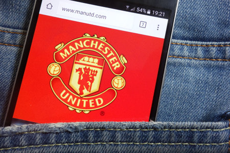 KONSKIE, POLAND - MAY 17, 2018: Manchester United website displayed on smartphone hidden in jeans pocket