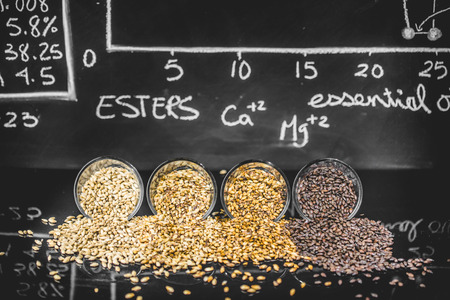 Beer Science ! Black Board with Graph, Data and Specs with Different Malted Grain Colors in Studio.