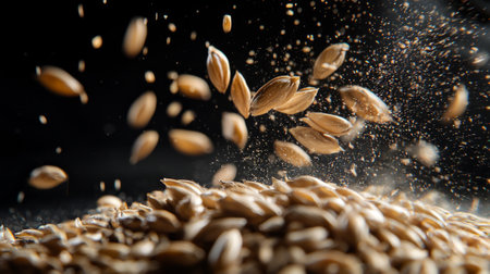 Barley groats are seen distinctly separated other captured mid air focus their unique shapes. dark backdrop enhances their natural beauty.