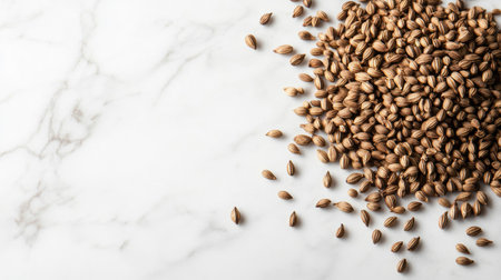 A close-up of a rich brown pile of cumin seeds scattered on a marble surface, highlighting the seeds' texture and color, perfect for culinary uses.