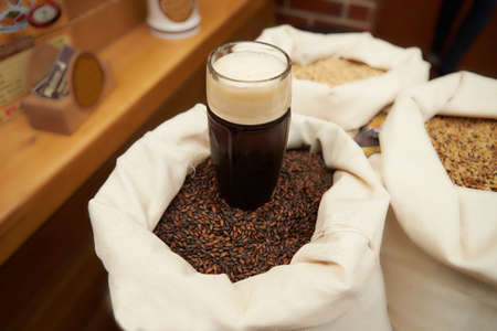 Tall beer glass with barley malt grains on a layer of malt