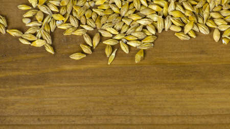 roasted malted or brewing barley on wooden ground, ingredient for a brewery or beer plant,