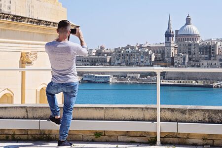 Caucasian student man behind with smartphone take photo of Valletta skyline cityscape