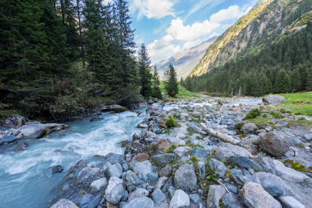 Mountain river and trees landscape natural environment. Hiking in the alps. Grawa Waterfall in Stubai Valley, Tyrol, Austria