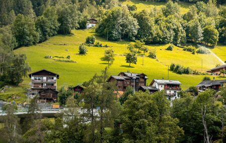 Summer view of alpine chalets in Switzerland. Beautiful outdoor scene in Swiss Alps