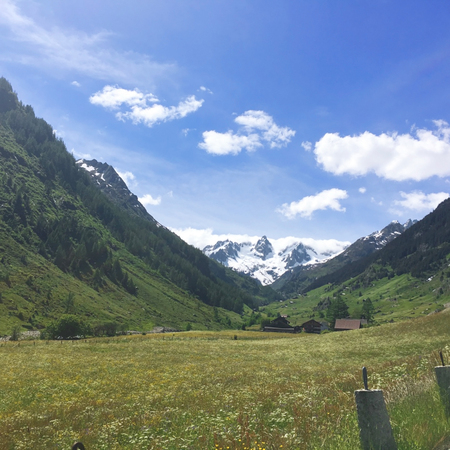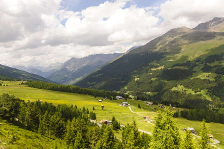 green fields in the otztal valley in the Austrian Alps of Tyrol on a cloudy summer day