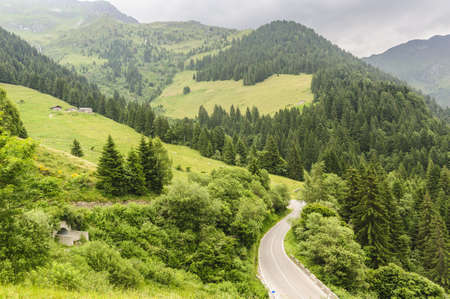 Beautiful alpine mountains, Austria. Fresh clean air, nature background. On the tops of the mountains lies snow all year round. Selective focus. Mountain scenic road, out of focus
