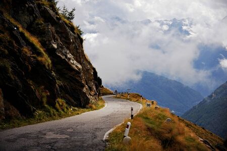 Sunlight falls on Gavia Pass alpine road in late autumn season