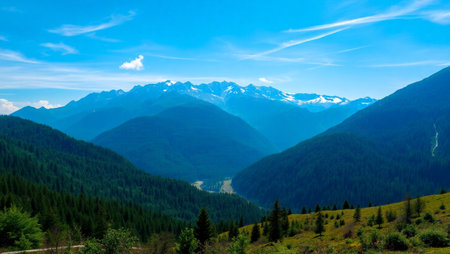 Pine forest in the mountain valley. Beautiful view of the mountain range.