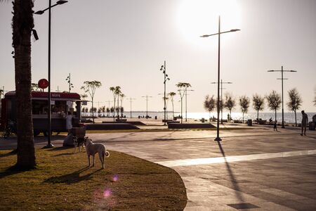 IZMIR, TURKEY, JULY 29, 2019: View of the Karantina square and coastline, street dogs walking on lawn. Shot at sunset