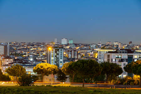 Istanbul night view of the city center. Skyscrapers, hotels and modern office buildings. Istanbul, Turkey.
