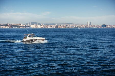 Istanbul, Turkey - September 22, 2019: Fishing enthusiasts catching fish at Bosphorus. Many migrating fish passing through Bosphorus.