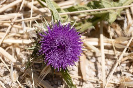 Close-up of a Purple Thistle Flower on Dry Ground