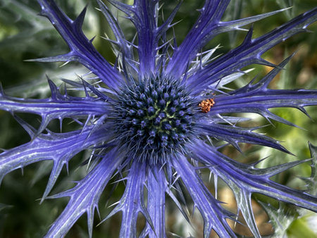 Close up of Eryngium hirsutum, or sea holly, species of flowering plant genus Eryngium, purple blue white spike flowers growing in organic gravel country garden Summer sun ladybird