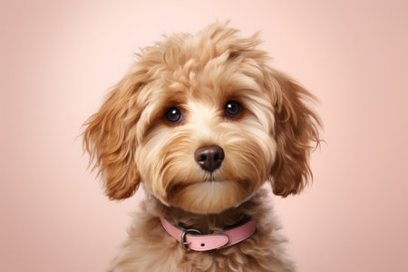 Cute Maltipoo dog with a bow on a pink background. High quality photo