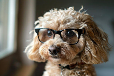 Cute, curlyhaired dog sporting black glasses gives the camera a focused gaze