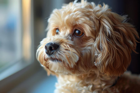 Closeup of a contemplative dog looking out a window, bathed in soft light