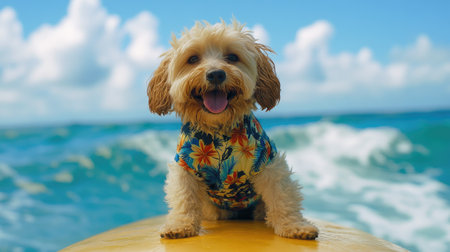 A cheerful small dog wearing a bright floral shirt enjoys the sun on a paddle board. The vibrant ocean waves and blue sky create a joyful summer scene.