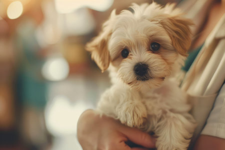 Generative AI, veterinarian doctor is holding in hands cute small puppy dog, vet clinic banner with copy space