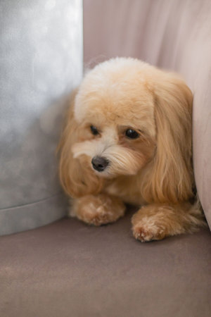 Cute Maltipoo dog on sofa at home