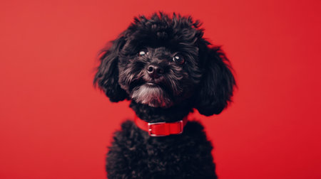 Adorable black poodle with a red collar sitting on a red background, showcasing its cuteness and playful demeanor