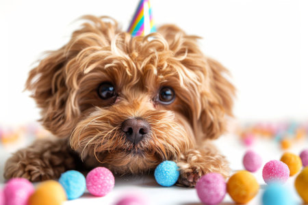 Cute birthday puppy against a vibrant backdrop