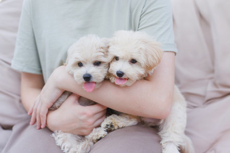 a young girl is playing with a maltipu dog. dog training concept,