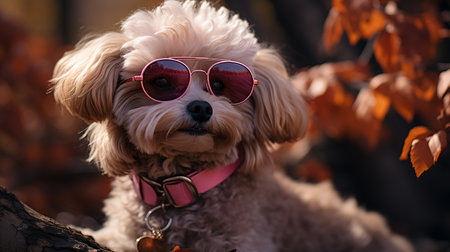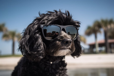 Dog beach sunglasses. White owner cute. Generate AI