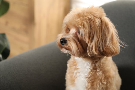 Cute Maltipoo dog on sofa at home, space for text
