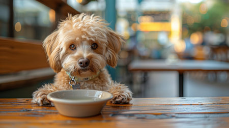 AI Generated. Charming dog sits patiently on light background with a treat nearby during a playful indoor moment