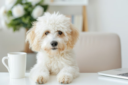 Adorable fluffy white puppy sitting at a desk with a coffee cup and laptop in a cozy home office.